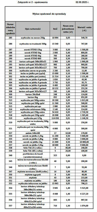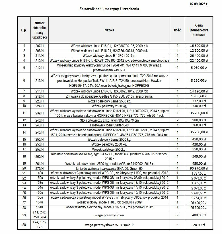 Syndyk masy upadłości Fruvitaland Spółki z ograniczoną odpowiedzialnością z siedzibą w Piotrawinie (sygn. akt IX GUp 28/20) oferuje do sprzedaży:1. maszyny i urządzenia w tym : linię do ważenia i pakowania GNA 60, wózki widłowe linde, wózki sadownicze. (załącznik nr 1)